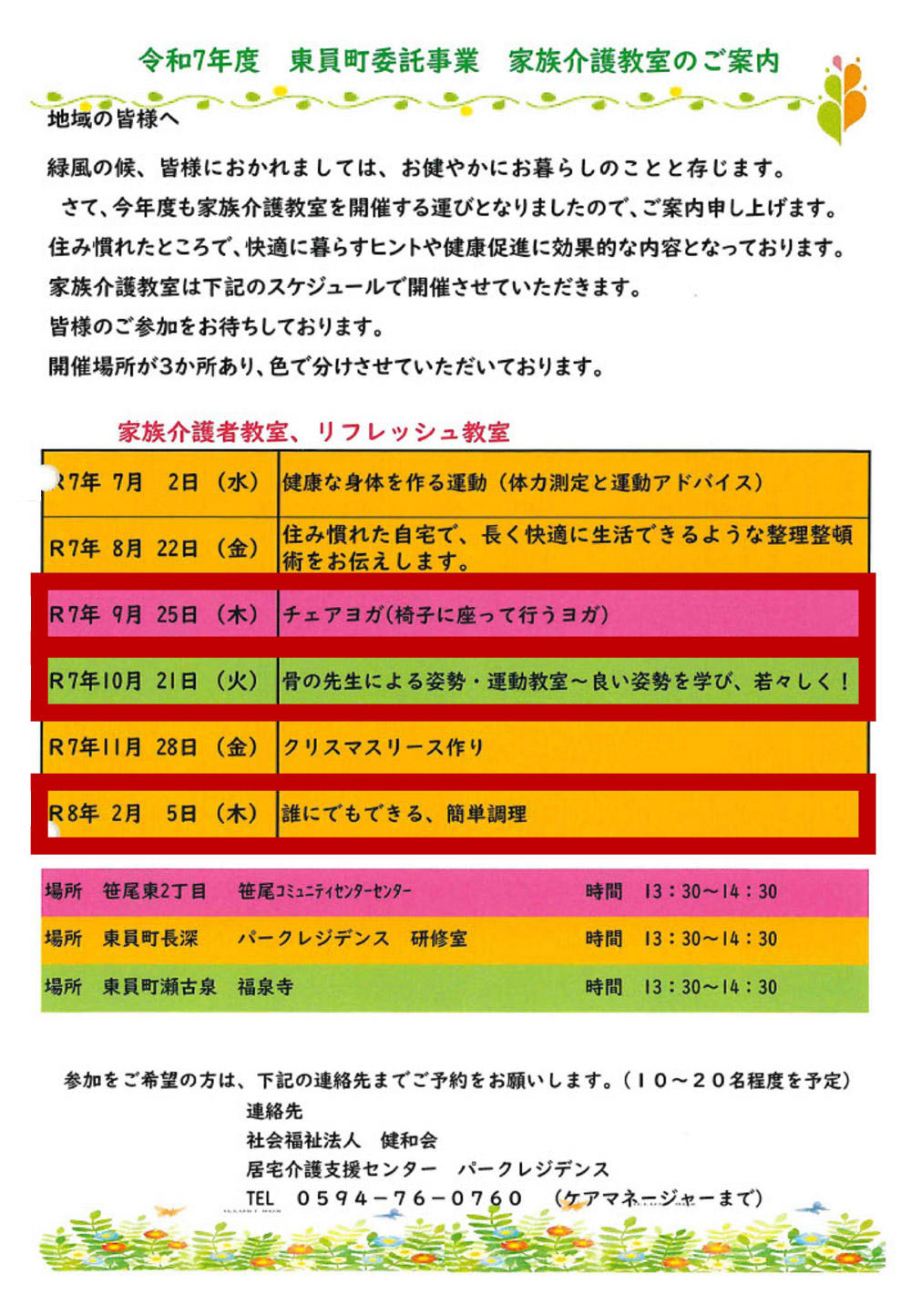 家族介護教室では、住み慣れた地域で健康に暮らすための様々な講話・イベントが行われます。(詳細はチラシをご確認ください)