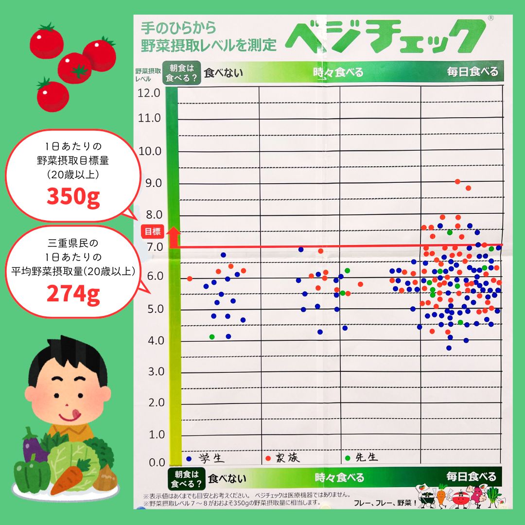 生活習慣病予防のために、一日に350g以上の野菜を摂取することが推奨されています。今回のベジチェックで推奨の数値を超えたのは、約20名でした。